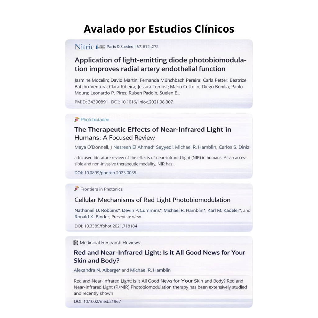 Los enlaces a los estudios utilizados como referencia están disponibles para su consulta, aportando transparencia y respaldo científico al uso de la luz roja e infrarroja cercana: