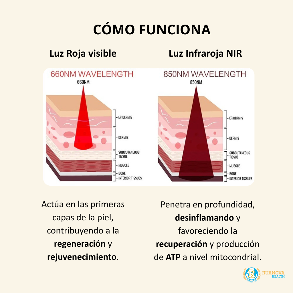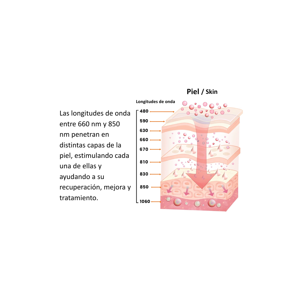La terapia de luz roja emplea longitudes de onda específicas (normalmente entre 660 nm a 850 nm – infrarrojo cercano) y una potencia muy elevada y controlada, diseñada para interactuar con los tejidos en diferentes capas y profundidades, y apoyar procesos biológicos a nivel celular.